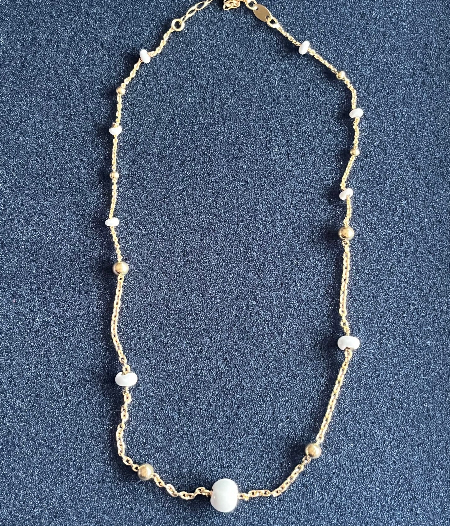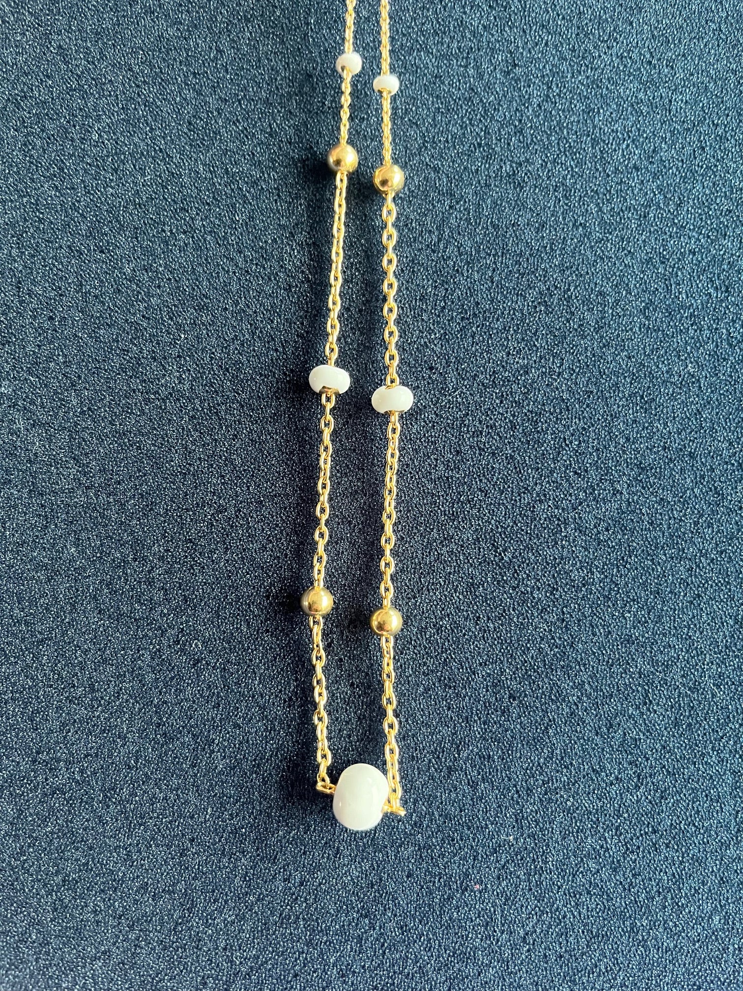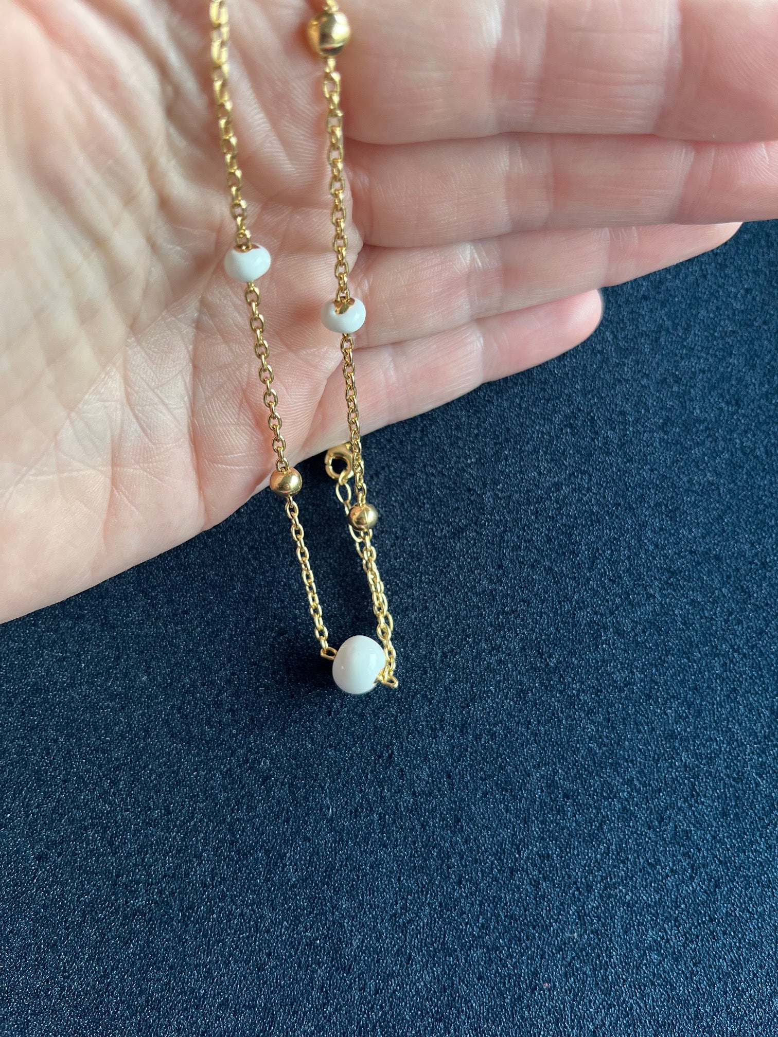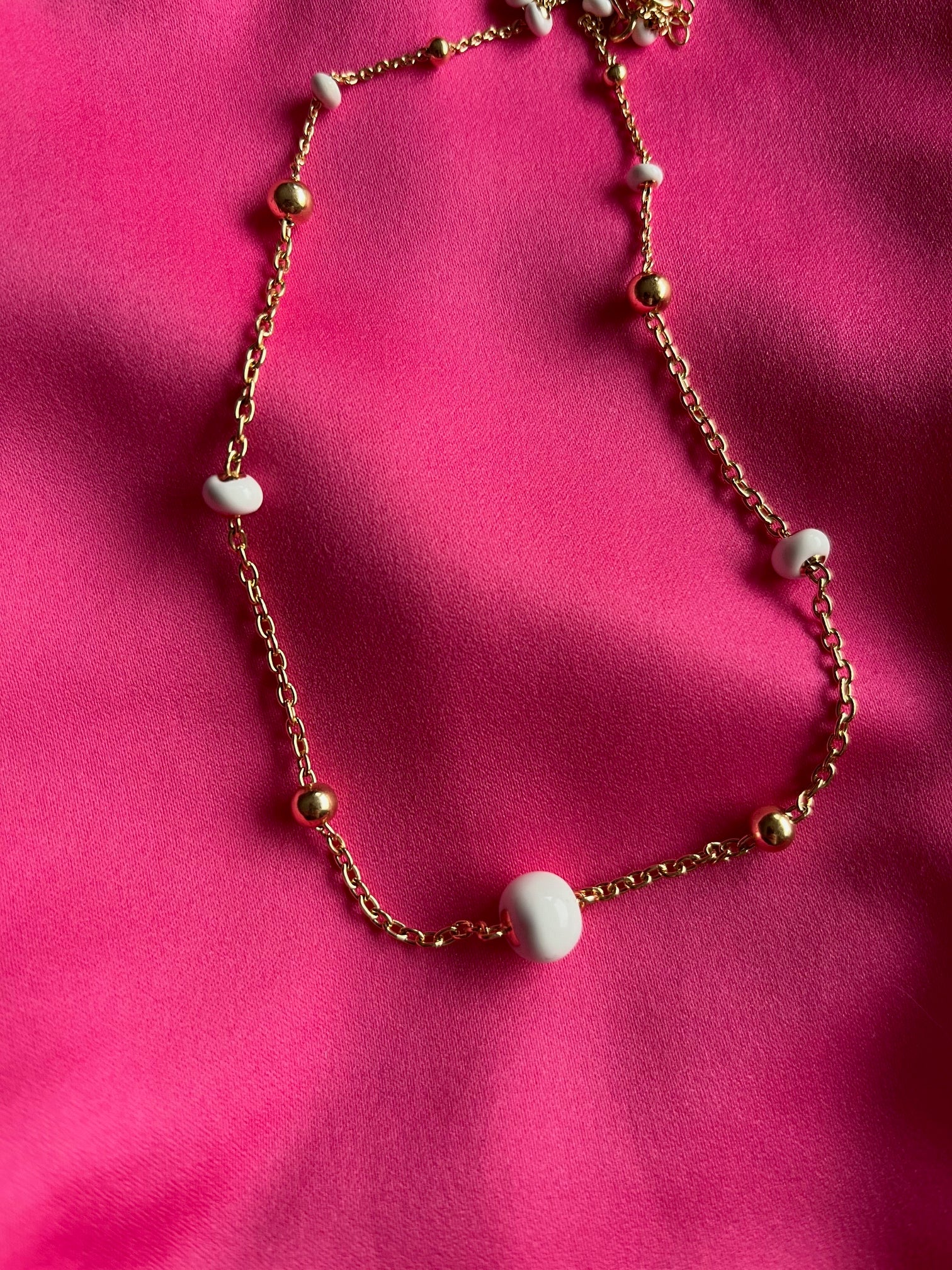 Rigtig smuk halskæde i 925 sølv med Emalje perler i hvid farve. Halskæden er guldfarvet og er justerbar. Den måler 40+5 cm. Perler kommer i forskellige størrelser: den største måler ca.7-8mm, de små perler måler 5mm og 3mm. Rigtig unikt look til enhver fest. Samlet vægt: 6,07g.