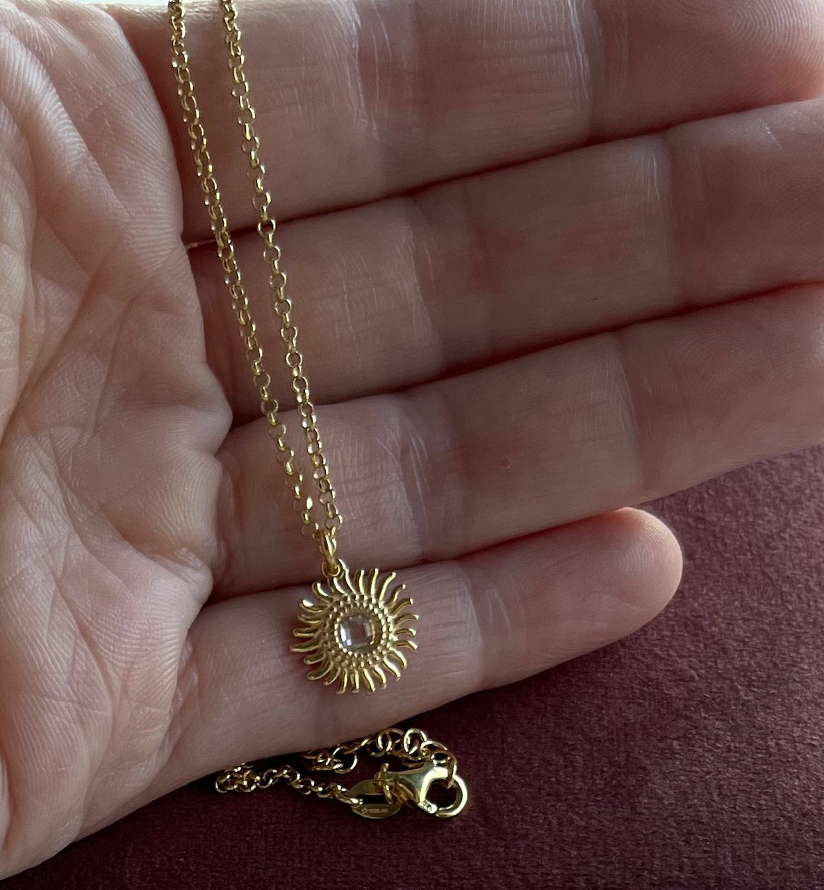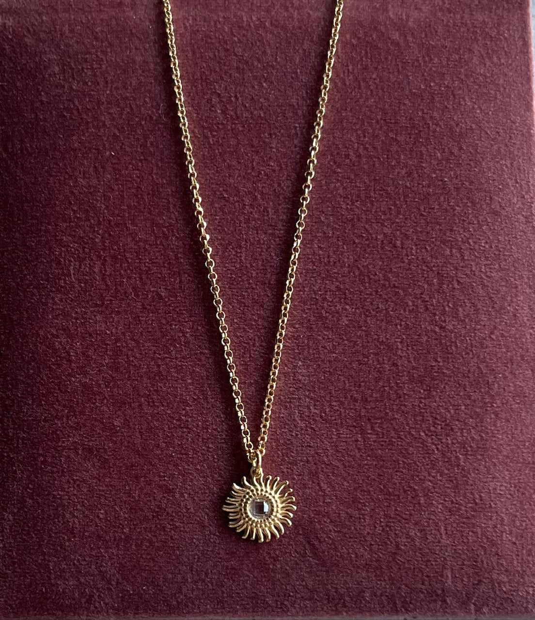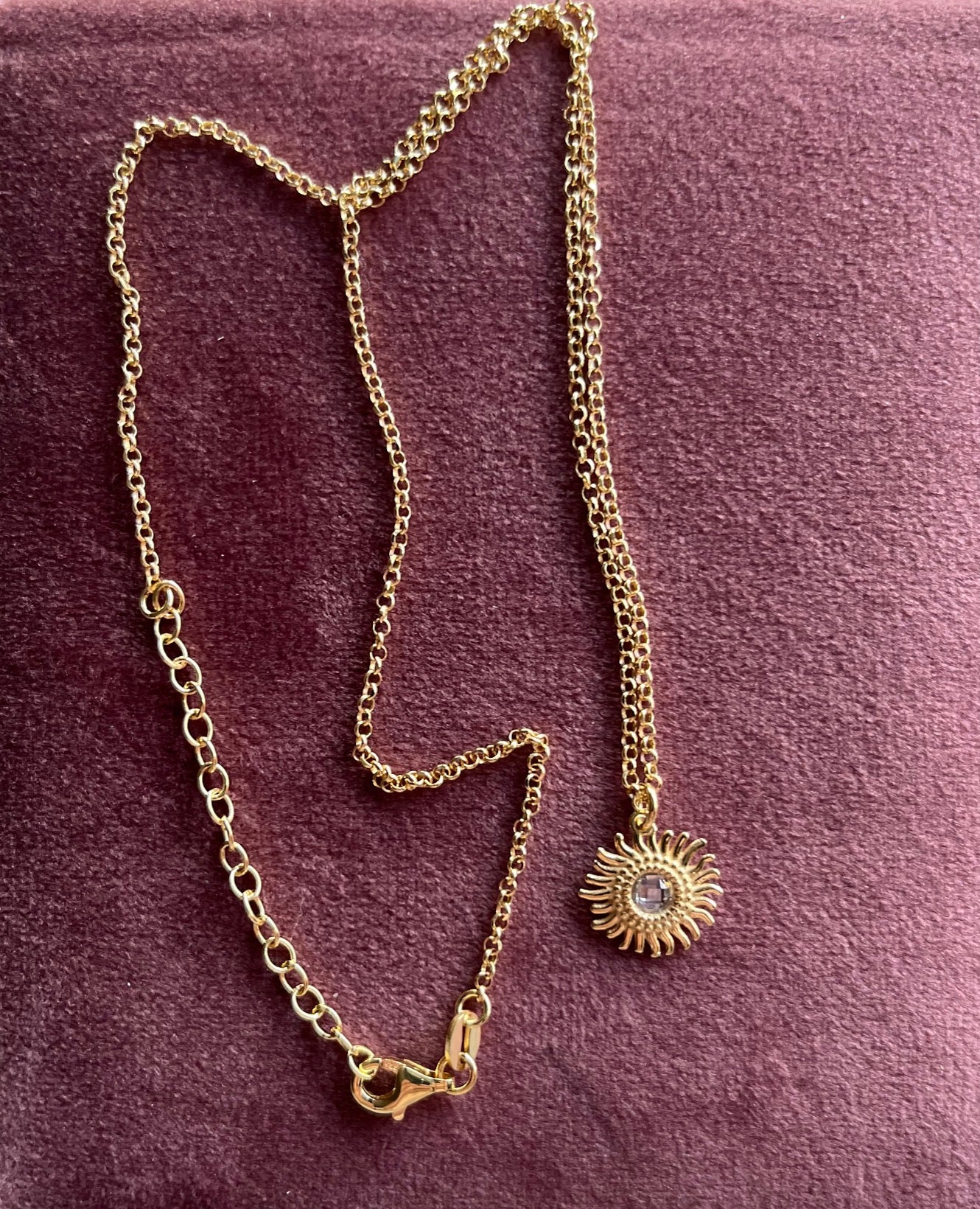 Smuk halskæde i 925 sølv med krystal. Vedhæng har en form for en sol og den måler ca. 12mm x 12mm. Krystallen indeni måler ca. 3mm. Halskæden er guldfarvet og er justerbar 40+5 cm. Rigtig unikt look til hverdag eller fest. Samlet vægt: 4,05g.