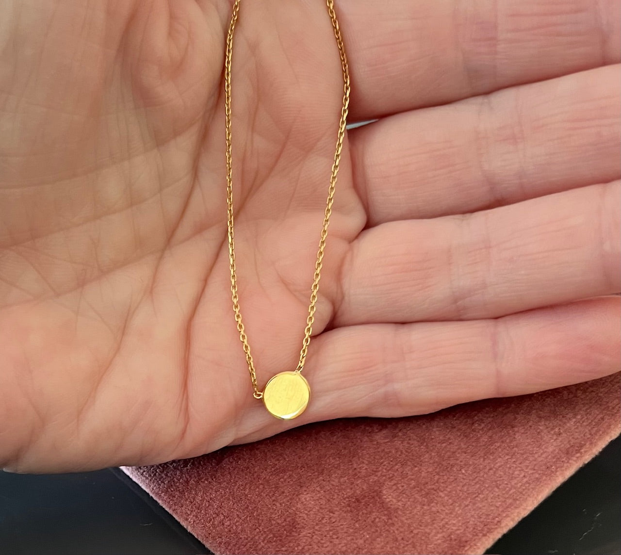 Smuk halskæde i 925 sølv med rund skive. Vedhæng måler ca. 12mm x 12mm. Krystallen indeni måler ca. 8mm i diameter. Halskæden er lavet af guldfarvet sterlingsølv. Den måler 45 cm. Rigtig smukt og delikat, perfekt til hverdag. Samlet vægt: 4,05g.